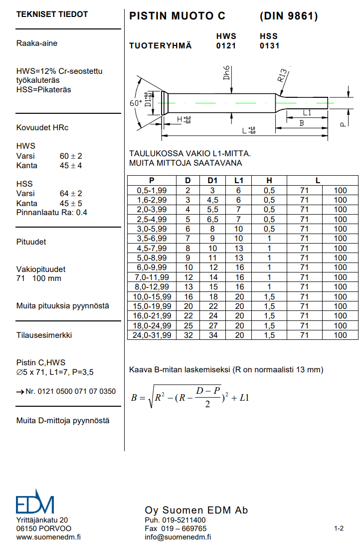 Vakiopituudet: 71 ja 100 mm (HSS saatavana tilauksesta myös 130, 160 ja 200)